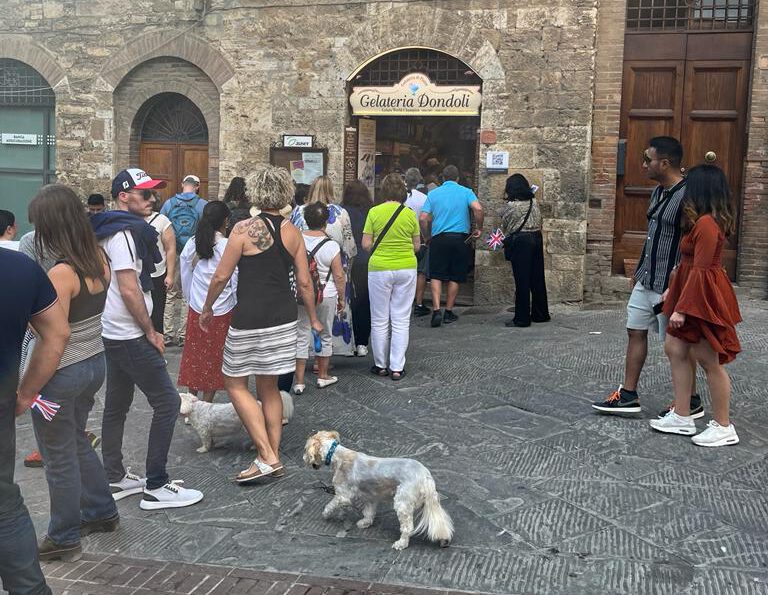 Op het plein bevind zich een héle lange rij bij Dondoli waar je gelato’s kunt halen. Wij hebben deze zelf niet geproefd, omdat de rij echt heel lang was en we weinig tijd hadden… helaas! Dit was niet eens in het hoogseizoen. Maar alsnog indrukwekkend om te zien hoelang mensen in de rij willen staan voor een gelato, die je bijna op elke hoek wel kan krijgen.